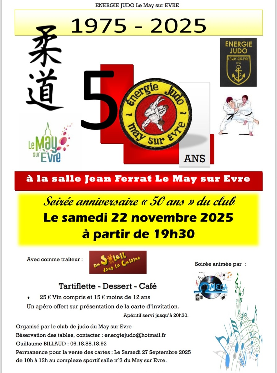👉🥳🥋 Une magnifique soirée des 50 ans de l'association Énergie Judo Le May sur Evre est entrain de se préparer le samedi 22 novembre 2025 à la salle Jean Ferrat.